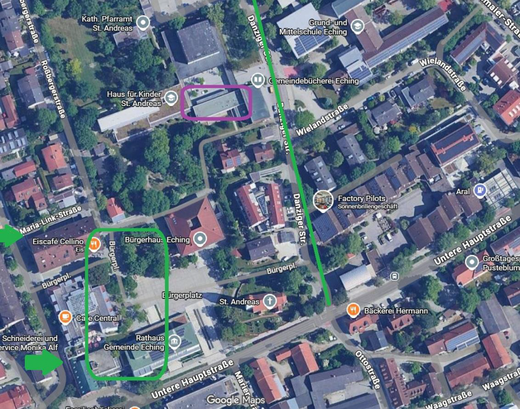 sowie in der Tiefgarage beim Echinger Rathaus (Fußweg ca. 3 Minuten).